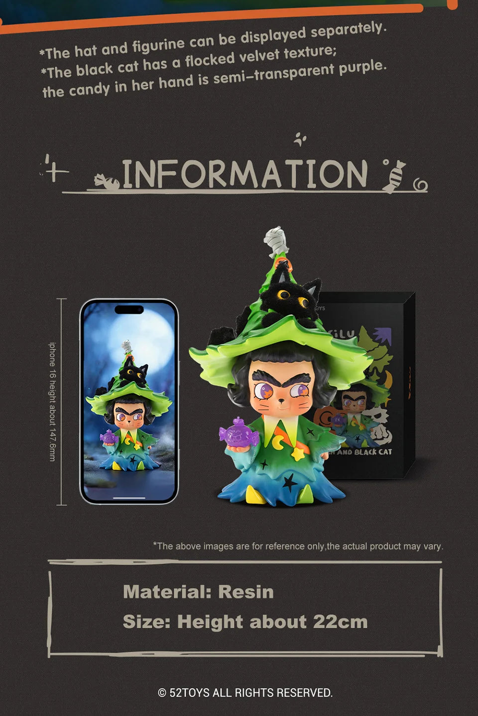 A: The 52TOYS CiCiLu The Witch and Black Cat collectible stands about 22 cm tall and features premium craftsmanship with intricate detail and a stunning First Edition finish.