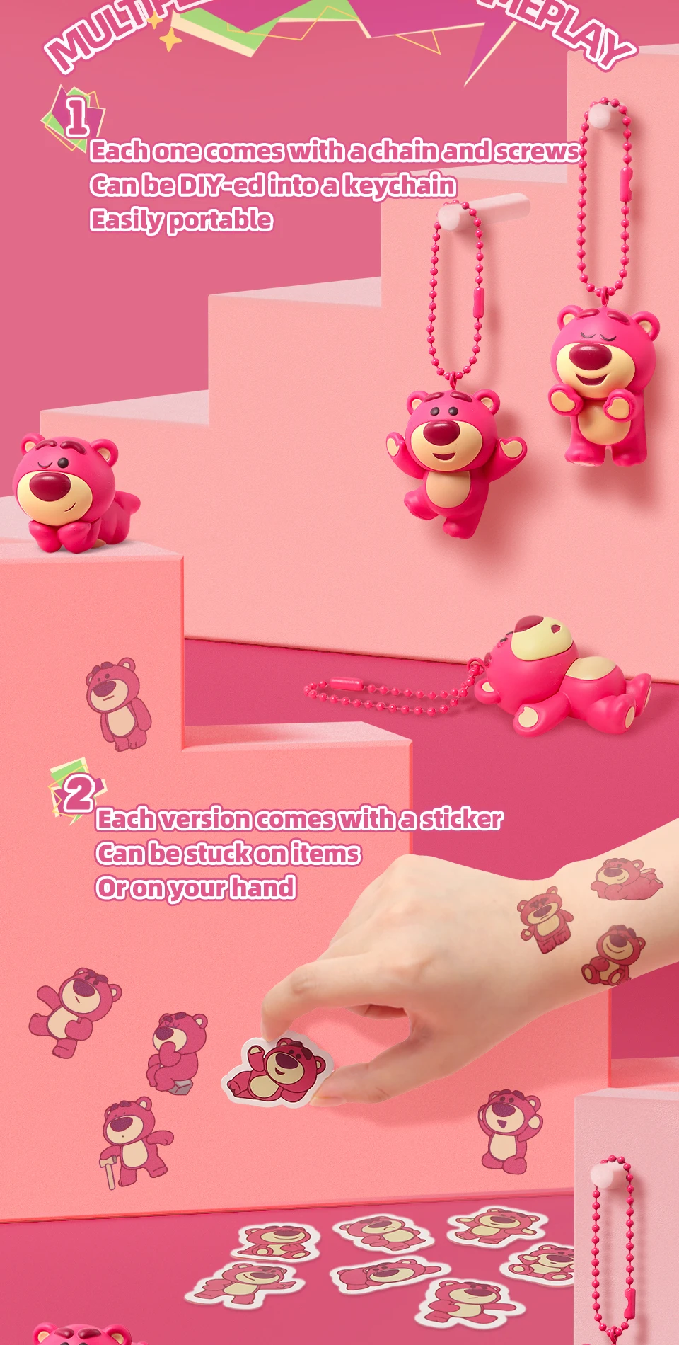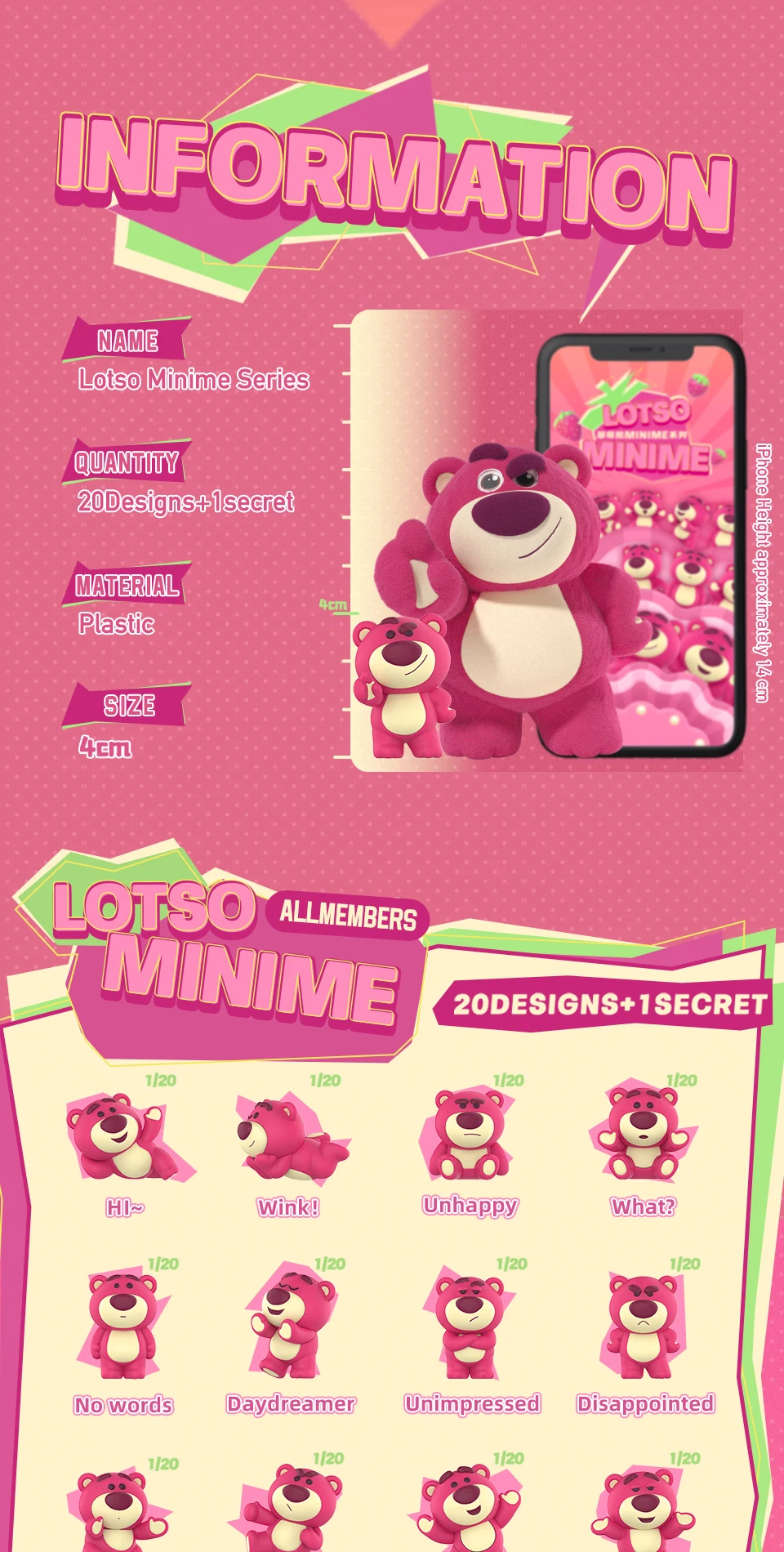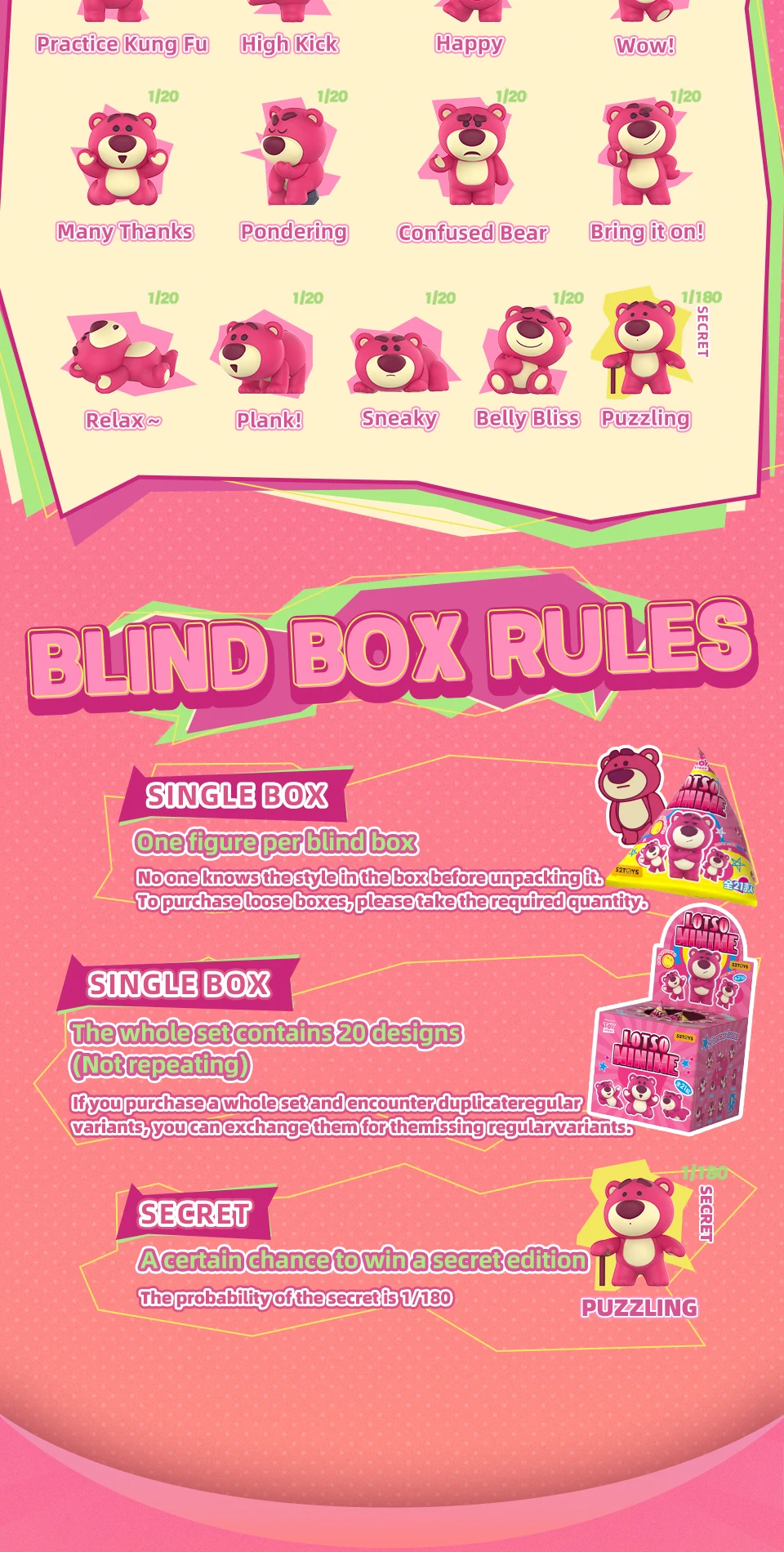 A: Each blind box contains one random Lotso Minime figure from the 20 standard designs or the 1 secret edition. Figures are made from plastic and stand around 4 cm tall. The design is only revealed when opened, making it a popular collectable for NZ and AU fans.