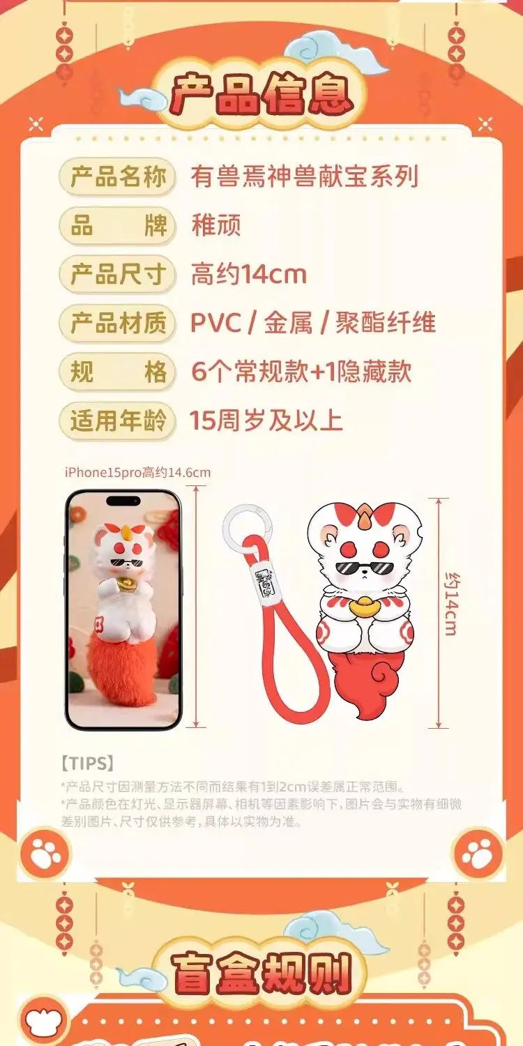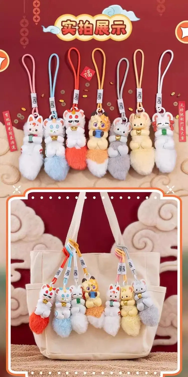 A: Each blind box contains one surprise Divine Beast keychain from the Fabulous Beasts Treasure Series. There are six standard characters to collect plus a rare secret edition. The figures combine PVC character designs with fluffy tails and loop straps, making them perfect as collectible bag charms.