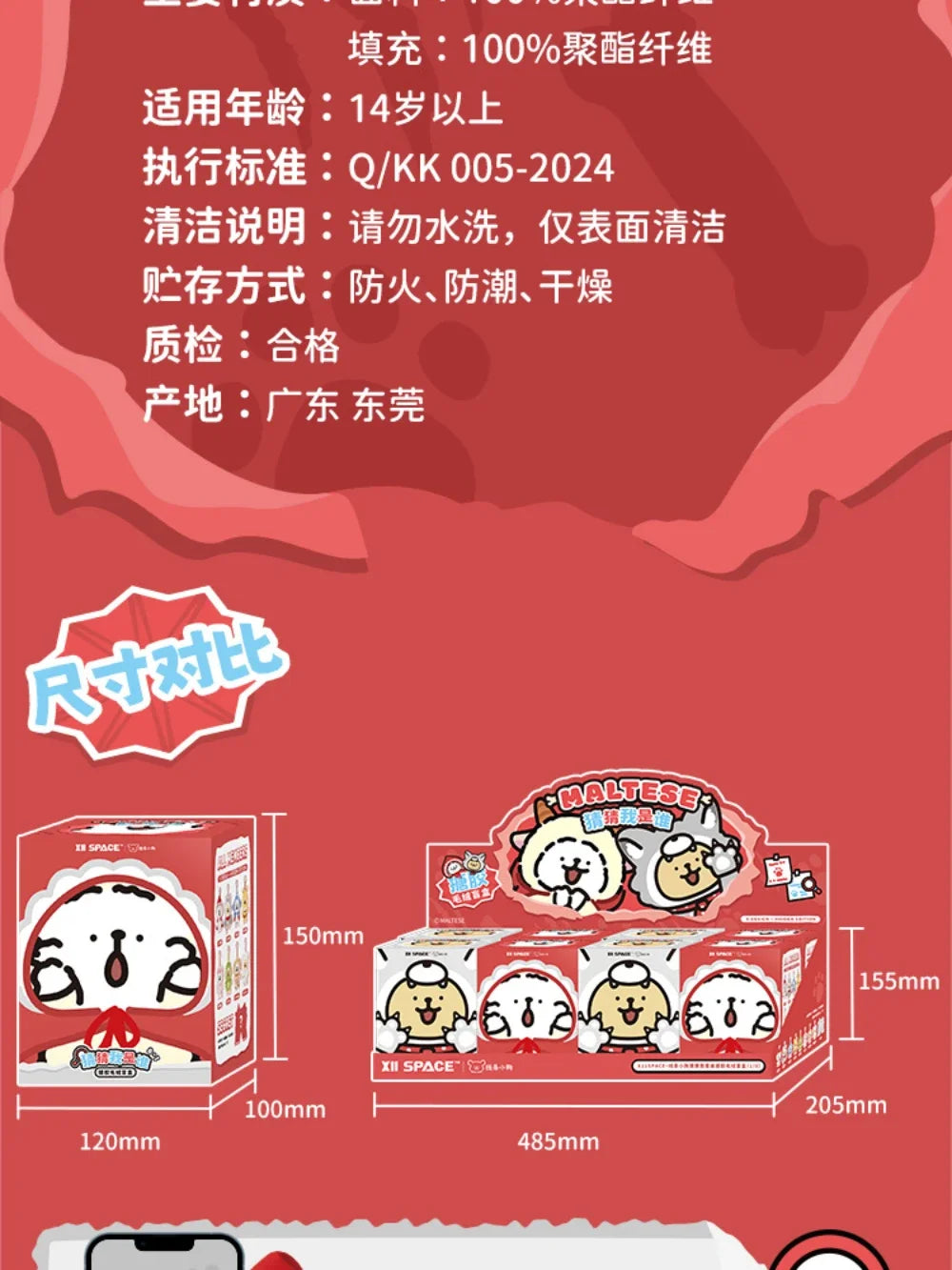 A: Each blind box includes one surprise Maltese plush designed by MEET PHOENIX. Standing about 13 cm tall, these kawaii collectibles feature unique costumes and detailed stitching for fans of cute designer toys.