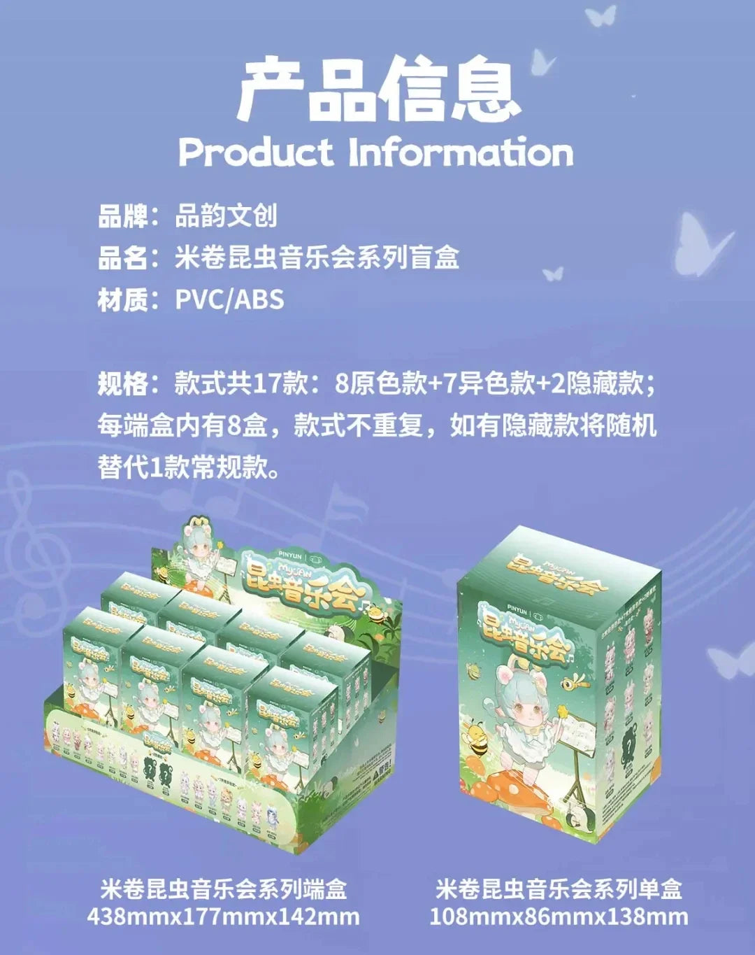 A: Each blind box in the MIJUAN Insect Concert Series includes one random kawaii-style insect musician designed by MEET PHOENIX, made from detailed PVC and perfect for collectors who love fantasy-themed figures.