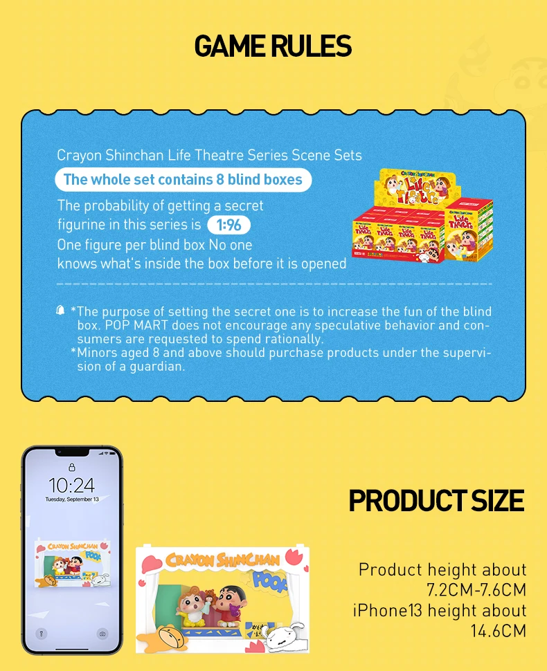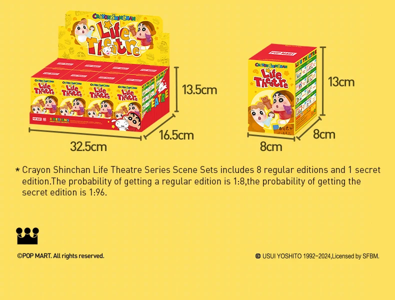 A: Each box contains one mystery miniature scene set from the Crayon Shinchan Life Theatre Series, packaged in original POP MART packaging.