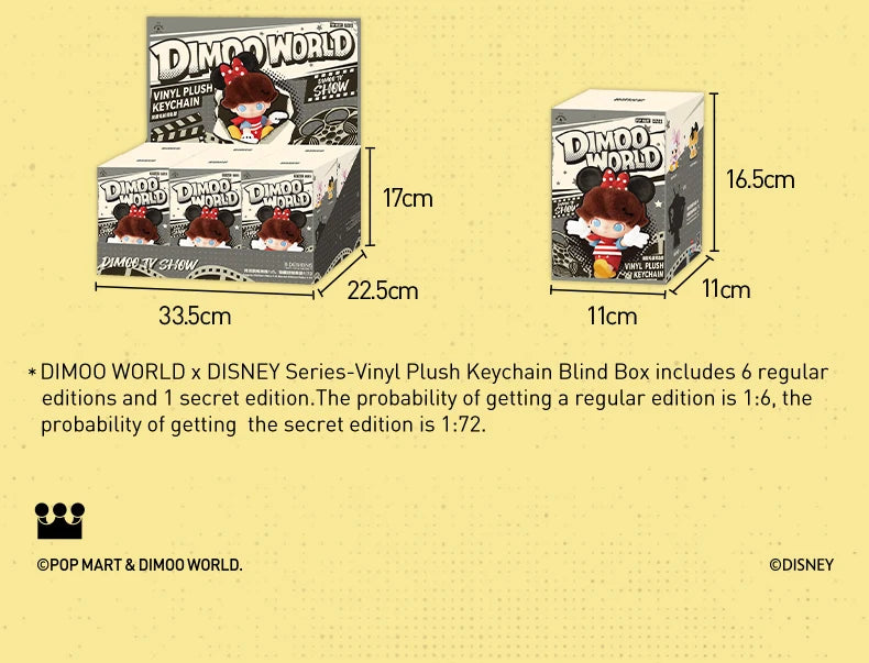 A: Each blind box contains one random DIMOO × Disney plush keychain from six designs, with a 1 in 72 chance to find the secret “Mickey TV Show.” The full set includes six blind boxes for a complete collection.