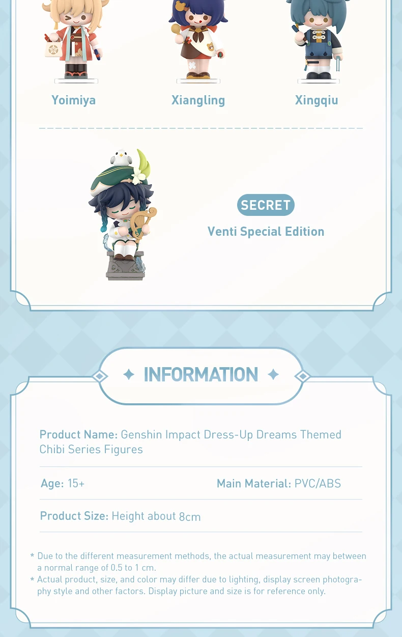 Dress-Up Dreams is a chibi-style blind box collection from POP MART featuring characters from the hit game Genshin Impact — reimagined in dreamy, dress-up costumes. Think iconic heroes like Zhongli, Venti, and Klee dressed in fantasy outfits you’ve never seen in-game.
