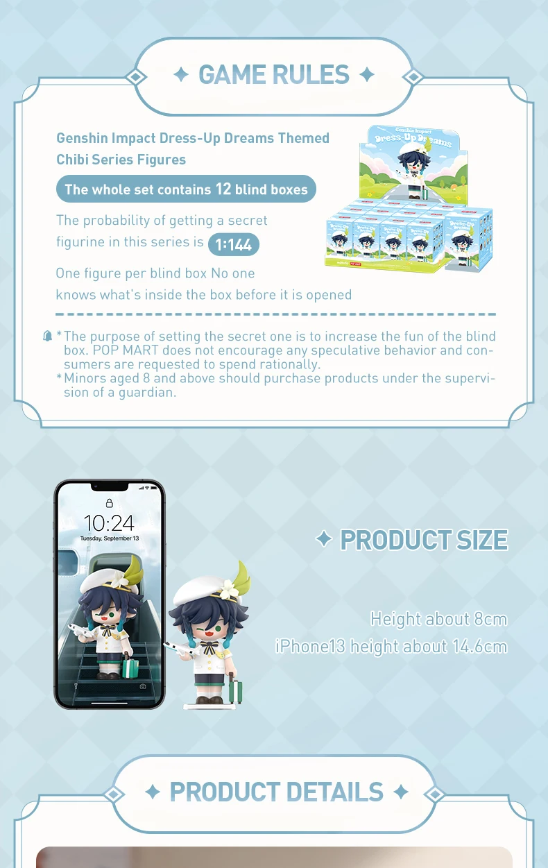 A: It’s a POP MART blind box featuring surprise Genshin Impact characters in dreamy, themed outfits. One random collectible per box, with rare figures to discover.