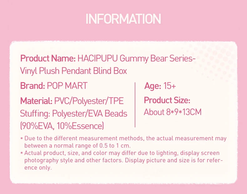 A: Each blind box includes one random HACIPUPU Gummy Bear pendant made from plush and vinyl materials, designed by POP MART for kawaii collectors and fans of cute toys.