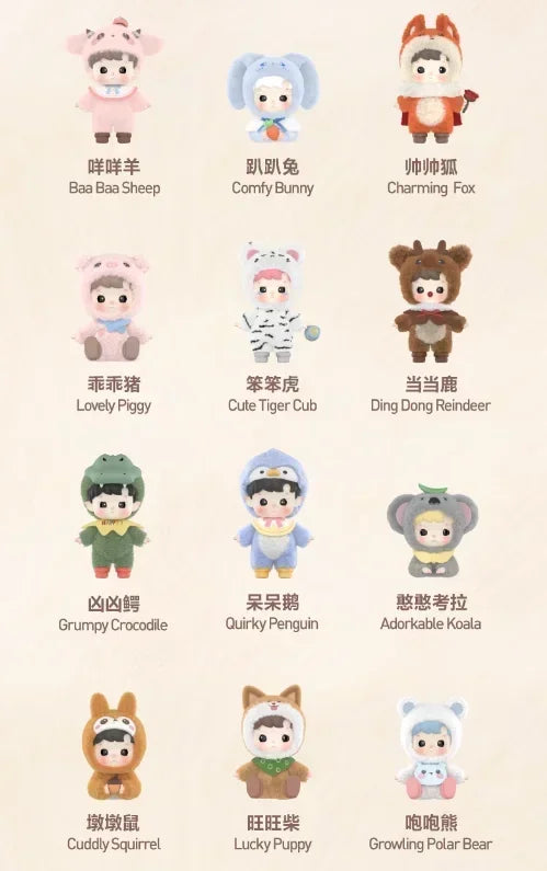 A: There are 12 characters in total, including 10 regular designs and 2 hidden editions, Kiss Penguin and Sweetie Pie. Each blind box contains one surprise figure featuring soft animal-themed outfits and detailed craftsmanship.