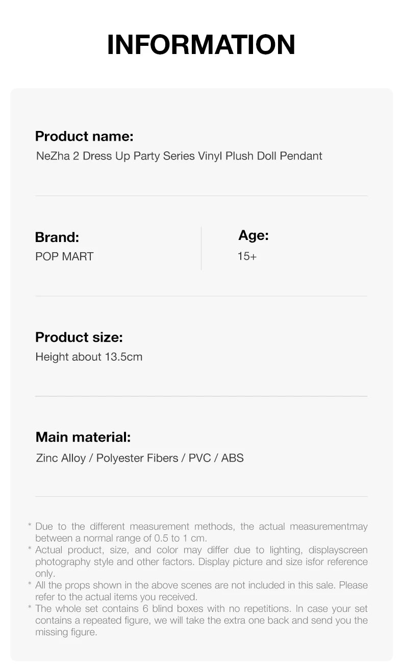 The POP MART NeZha 2 Dress Up Party Series blends soft plush textures with vinyl detailing, transforming the beloved NeZha characters into wearable pendant collectibles. Each blind box contains one randomly selected doll from the series, designed for collectors who love cute character styling with a playful costume twist.