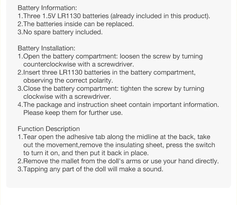 • Materials: Polyester plush with PVC and ABS components, polyester fibre stuffing