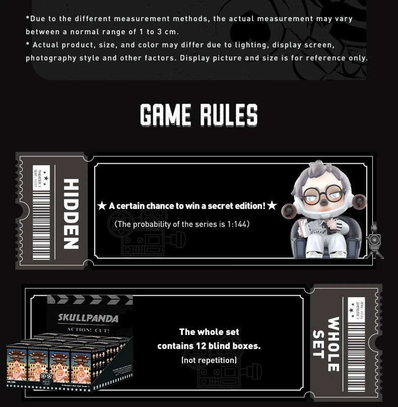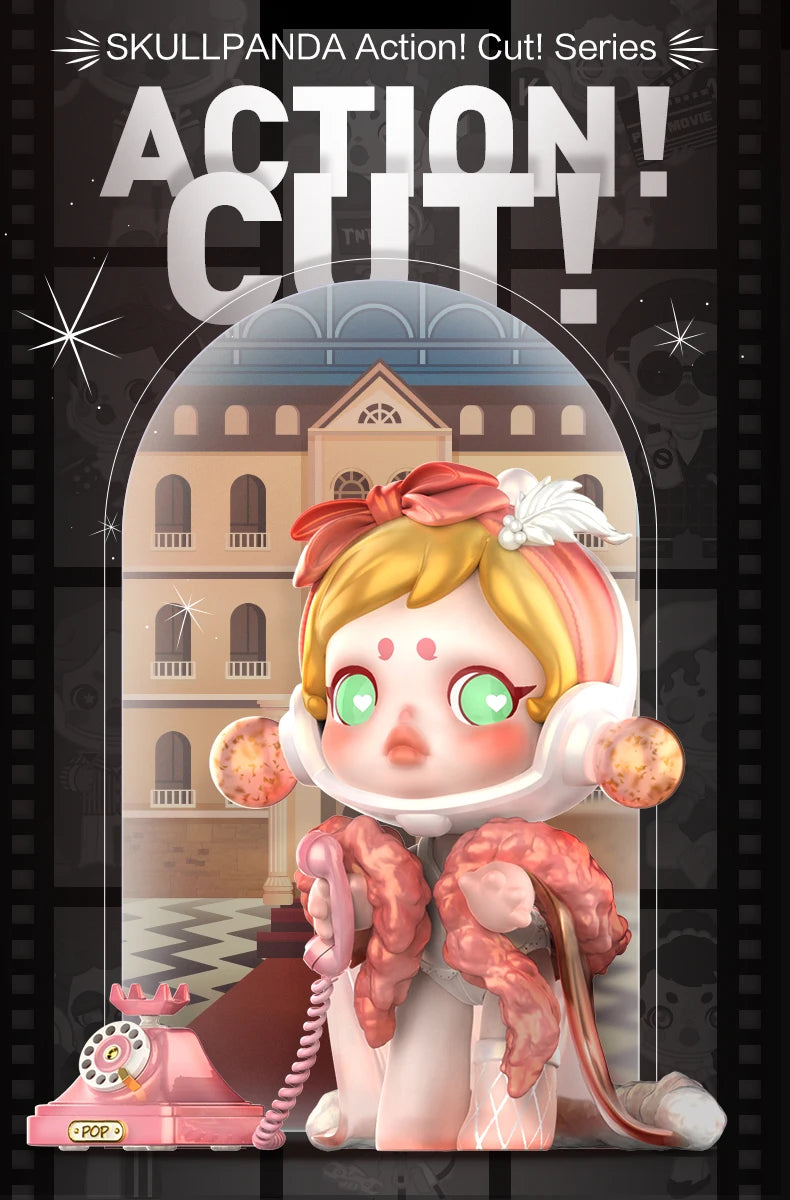 Step behind the scenes with the POP MART SKULLPANDA Action Cut! Series, a cinematic collection celebrating the magic of filmmaking. Each blind box hides one of twelve movie-inspired SKULLPANDA characters, from “Leading Man” to “Comedian”, plus a hidden “Cool Director” chase figure. With detailed props, expressive faces, and clever references, this series brings Hollywood flair to your collection.