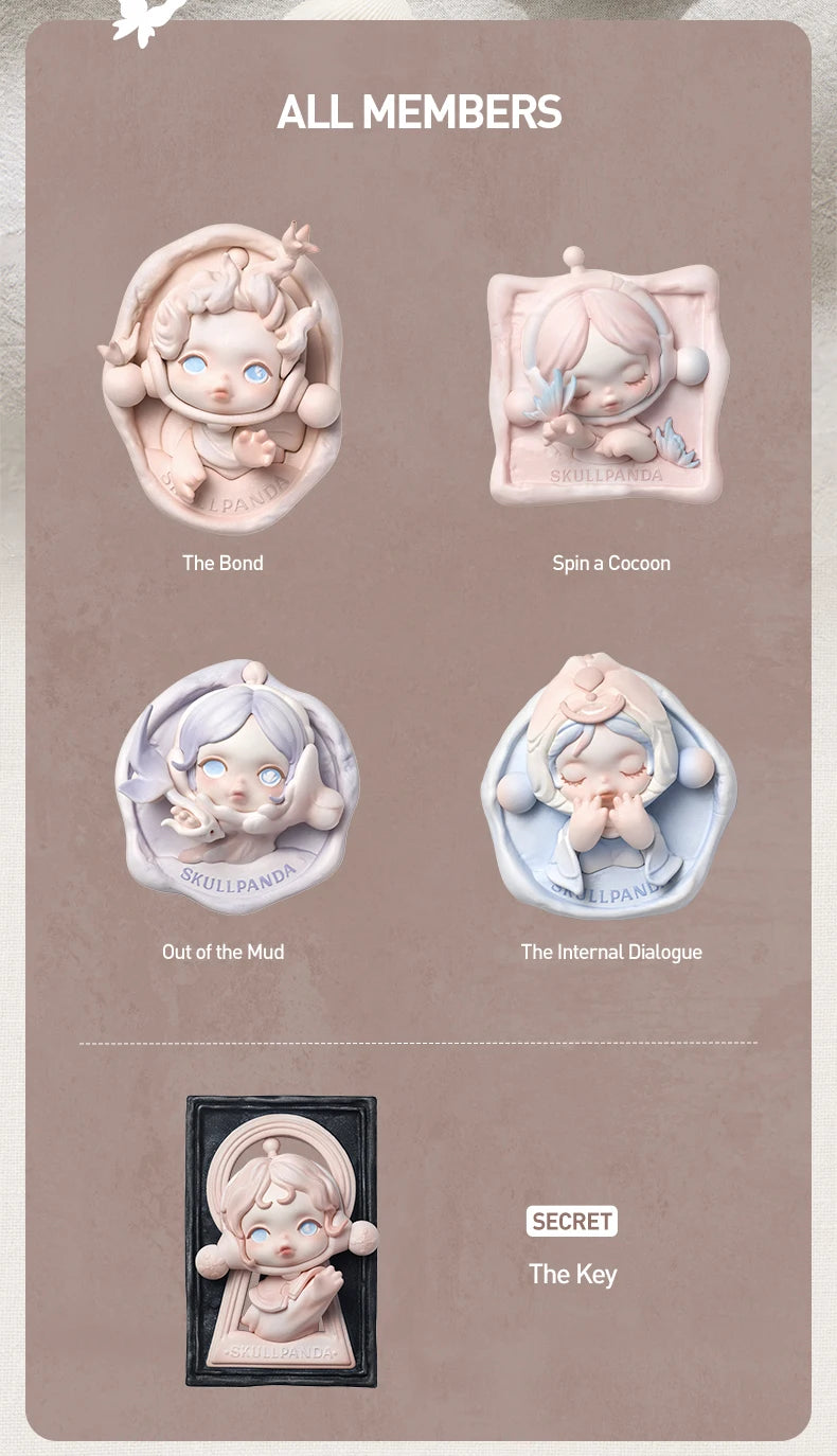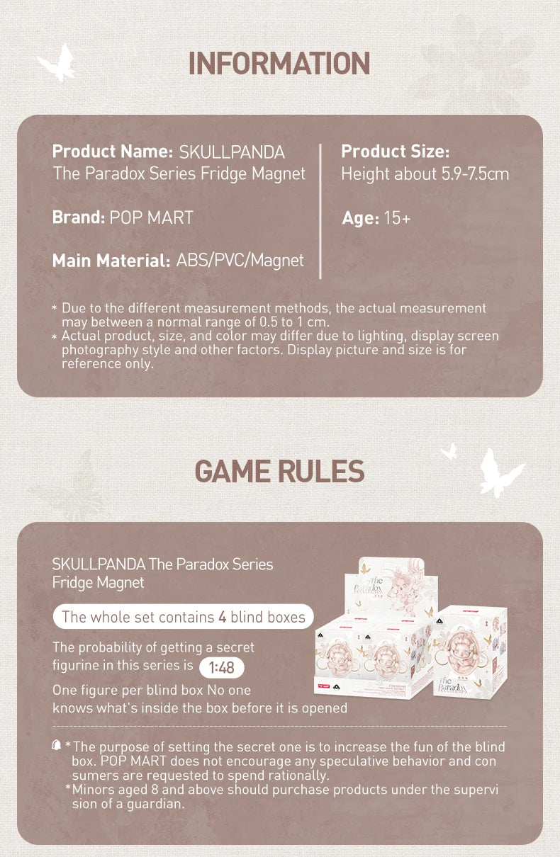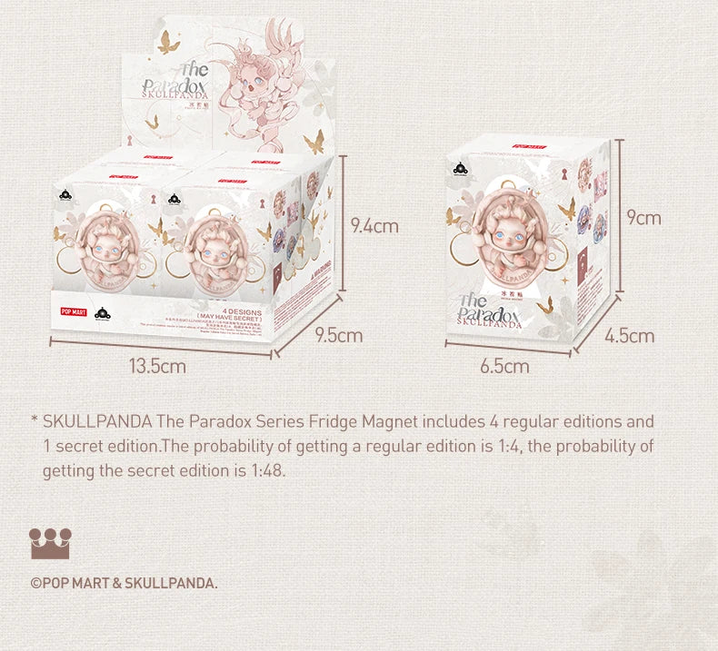 A: Each blind box includes one random Skullpanda Paradox magnet from four main designs, with a 1 in 48 chance of finding the secret “The Key.” The full set contains four blind boxes.