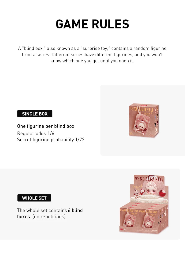 • Each blind box contains 1 randomly selected SKULLPANDA plush mini bag