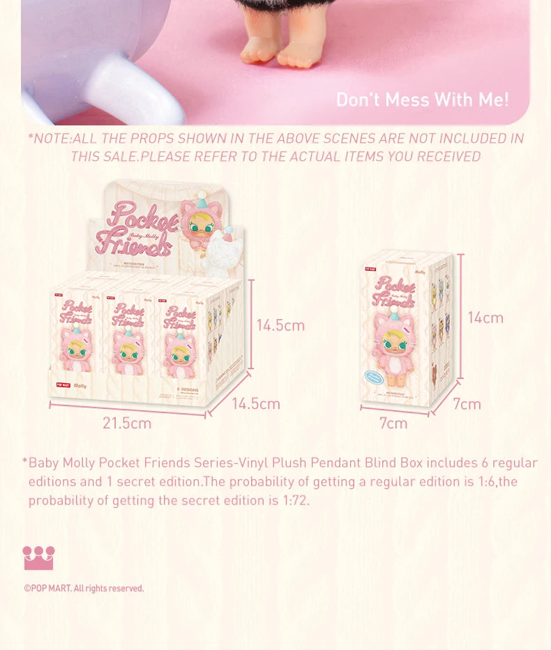 A: Each sealed blind box contains one random Baby Molly vinyl plush pendant from 6 regular designs or the rare 1/72 secret “Don’t Mess With Me” edition. Every unboxing is a cute surprise for fans in New Zealand and Australia!