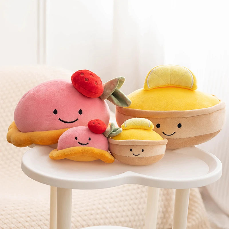 A: They’re available in two sweet designs — Strawberry Cake and Lemon Mousse — and two sizes, 10 cm and 20 cm. Each plush features ultra-soft short fabric and PP-cotton filling for a cosy, cuddly feel.